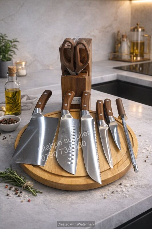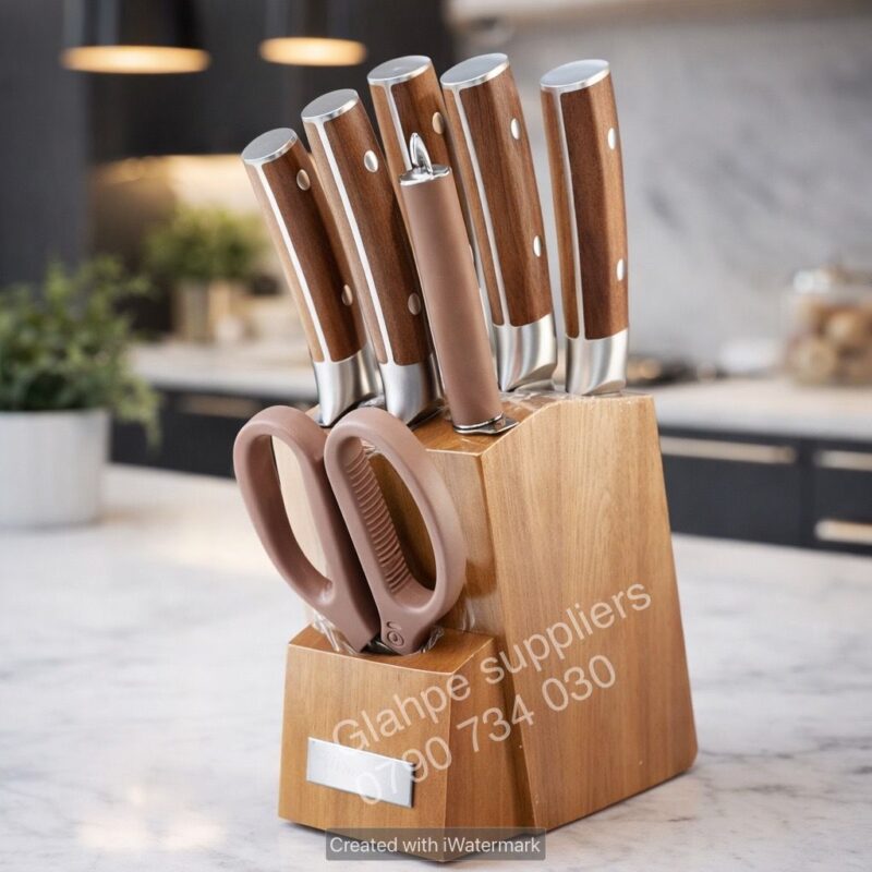 - Ideal for home cooks and professionals alike, this knife set is a must-have for efficient and stylish kitchen prepChef Knife ❇️8” Bread Knife ❇️7” Cleaver Knife ❇️5” Utility Knife ❇️3.5” Paring Knife ❇️Scissors ❇️Sharpening Steel ❇️Holder