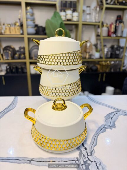 - Featuring a sophisticated honeycomb-patterned exterior in classic white and black, accented with luxurious gold-tone handles and bases for a truly opulent look.