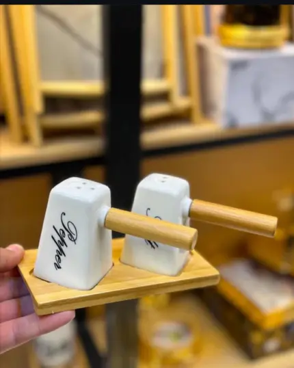 Ceramic Salt & Pepper Shaker Set with Wooden Handles & Tray – Elegant Tableware