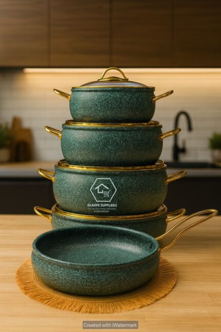 Elevate your culinary experience with this stunning and durable 9-piece granite coating kitchen cookware set. Designed for both efficiency and style, this set ensures healthy cooking with less oil and effortless food release. The vibrant green speckled exterior with elegant gold-tone handles adds a touch of sophistication to any kitchen decor.