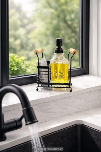 Keep your kitchen sink area neat and stylish with this modern soap dispenser and sponge holder set. Designed with a sturdy black metal frame and elegant wooden handles, this compact organizer combines practicality with a contemporary look.