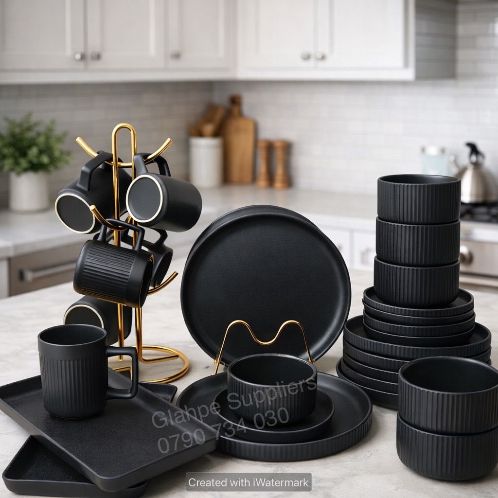 Add understated elegance to your dining table with this 32-piece ceramic dinnerware set, thoughtfully designed to serve 6 people. The set features a classic black finish with a refined ribbed design and a slightly rough outer texture, giving each piece a modern handcrafted feel while ensuring a comfortable, secure grip.