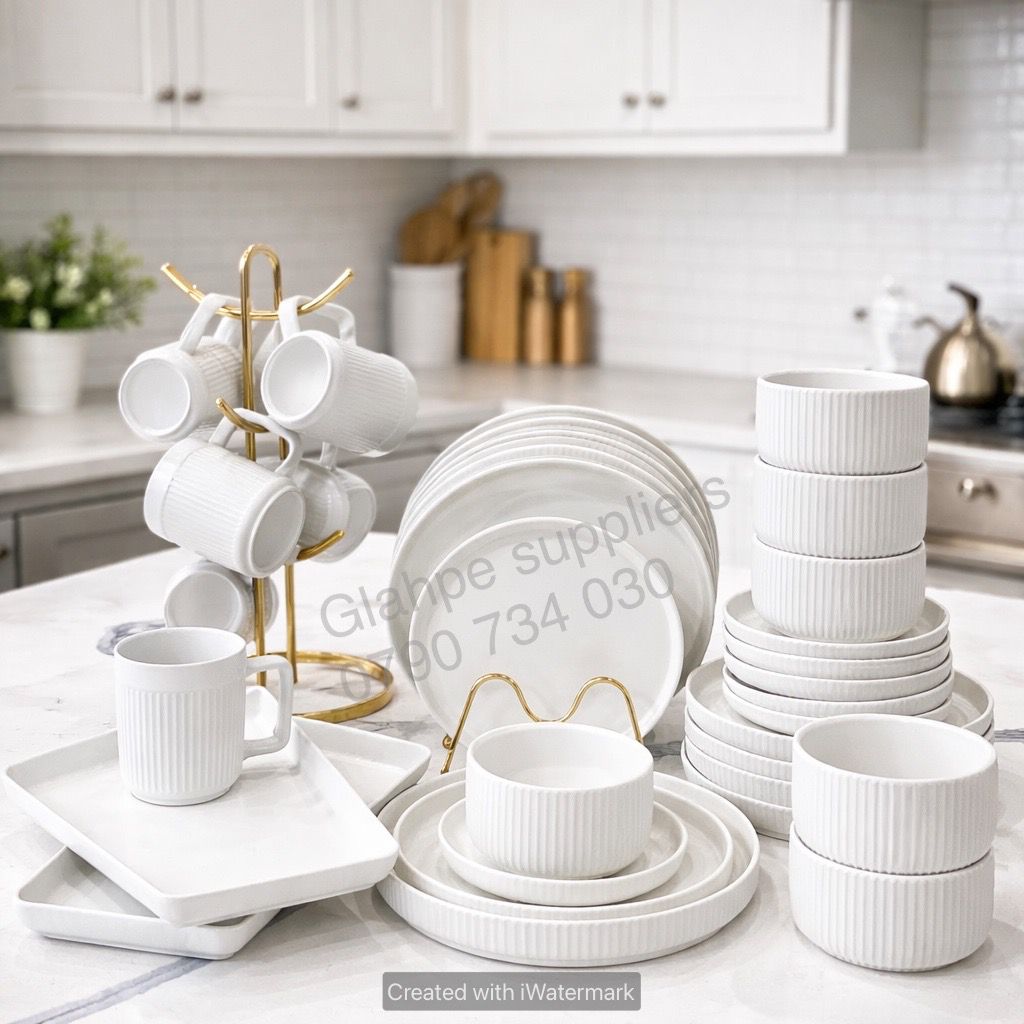 Add understated elegance to your dining table with this 32-piece ceramic dinnerware set, thoughtfully designed to serve 6 people. The set features a classic white finish with a refined ribbed design and a slightly rough outer texture, giving each piece a modern handcrafted feel while ensuring a comfortable, secure grip.