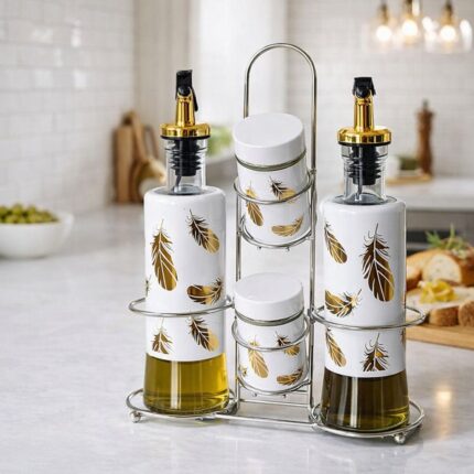 Designed with a modern feather pattern, this set adds a touch of sophistication to your countertop or dining table. The oil bottles feature easy-pour spouts for smooth, mess-free dispensing, while the spice jars keep your seasonings fresh and within reach. The sturdy stand keeps everything neatly arranged and saves space.