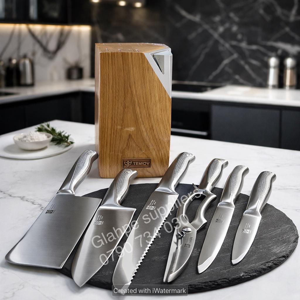 • Ideal for home cooks and professionals alike, this knife set is a must-have for efficient and stylish kitchen prepChef Knife ❇️8” Bread Knife ❇️7” Cleaver Knife ❇️5” Utility Knife ❇️3.5” Paring Knife ❇️Scissors ❇️Sharpening Steel ❇️Holder