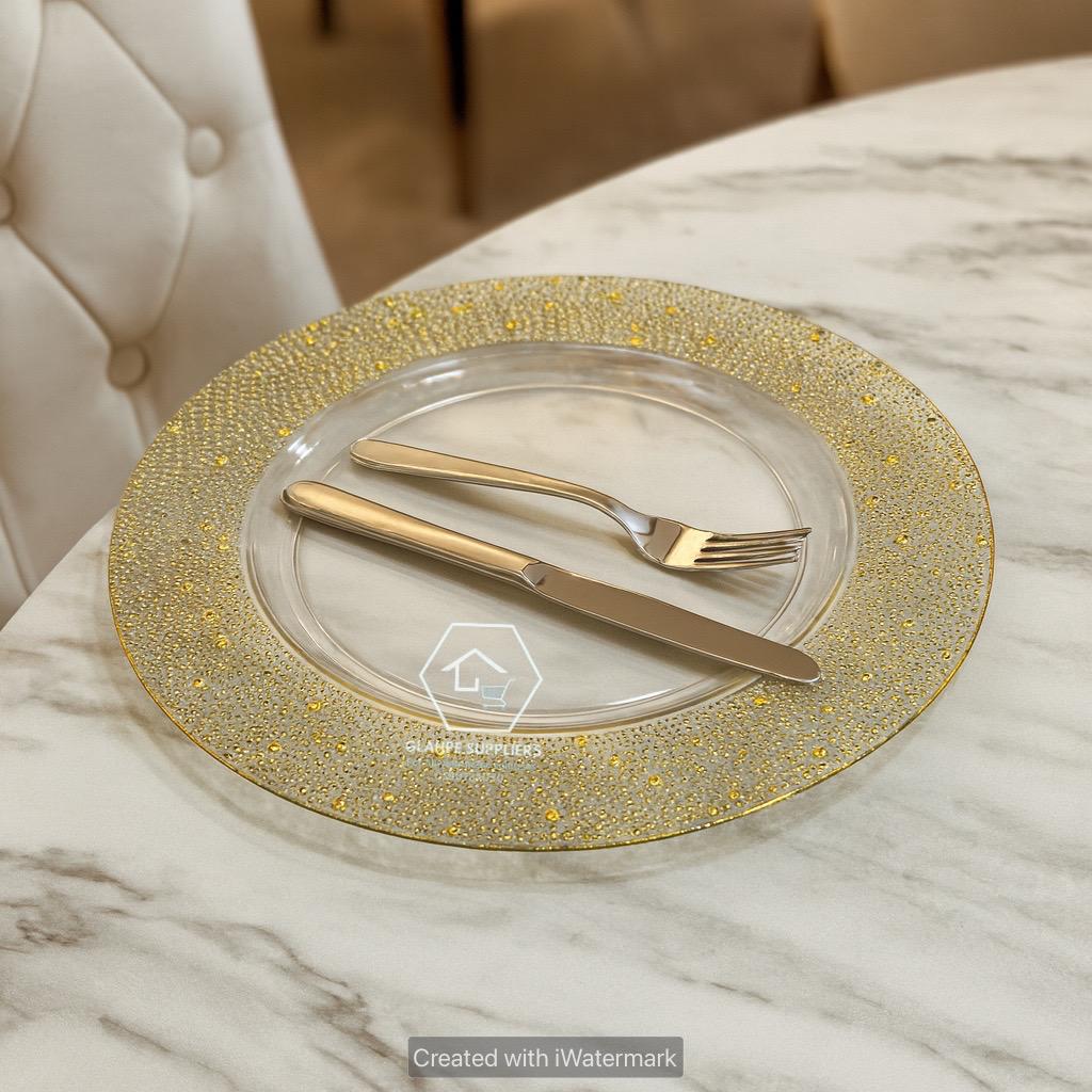 The charger features a sparkling textured gold decorative rim paired with a clear center, making it a versatile base for dinner plates and an eye-catching accent for weddings, banquets, hotels, and special events. Ideal for both formal and upscale everyday table décor.