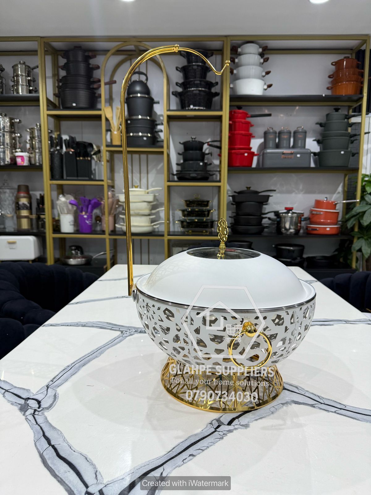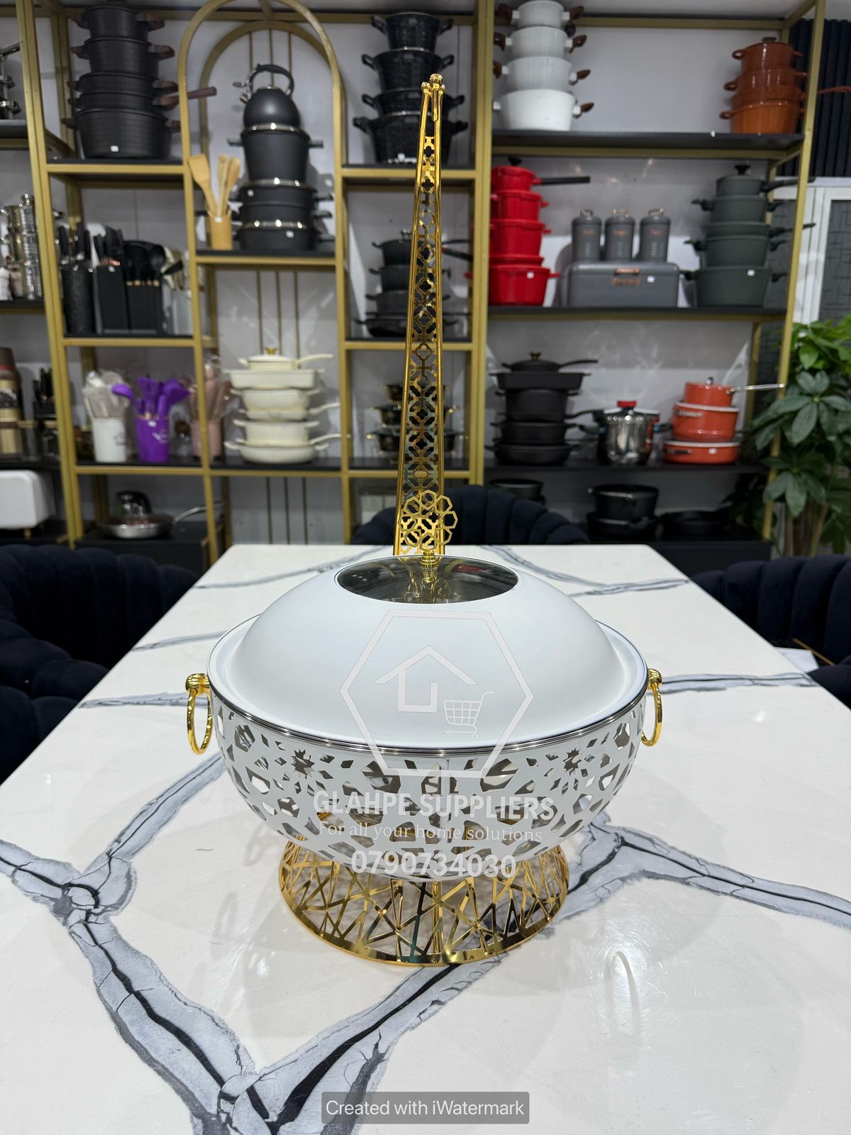 Luxurious Gold and White Round Chaffing Dish.