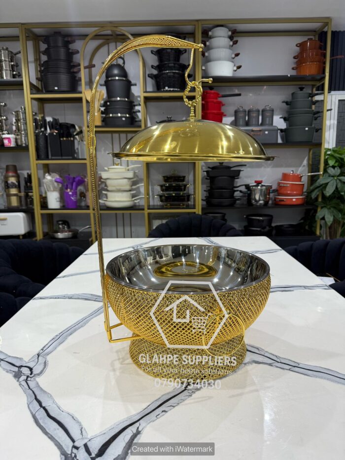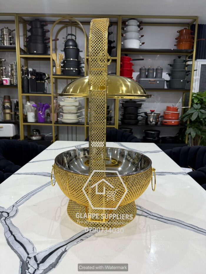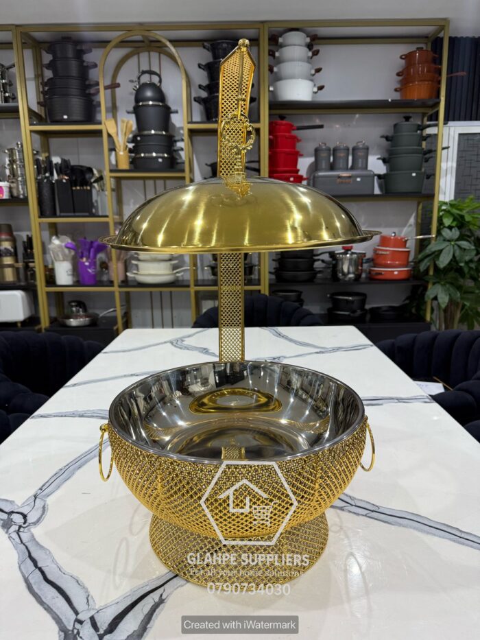 Add a touch of opulence to your next event with our Luxurious Gold Round Chafing Dish. Exquisitely designed with a gleaming gold-tone finish, this chafing dish combines style with functionality, making it the perfect centerpiece for upscale occasions.
