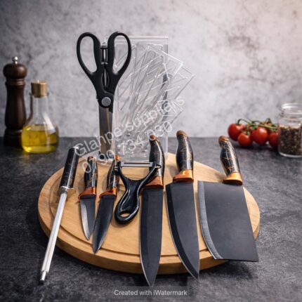 • Ideal for home cooks and professionals alike, this knife set is a must-have for efficient and stylish kitchen prepChef Knife ❇️8” Bread Knife ❇️7” Cleaver Knife ❇️5” Utility Knife ❇️3.5” Paring Knife ❇️Scissors ❇️Sharpening Steel ❇️Holder