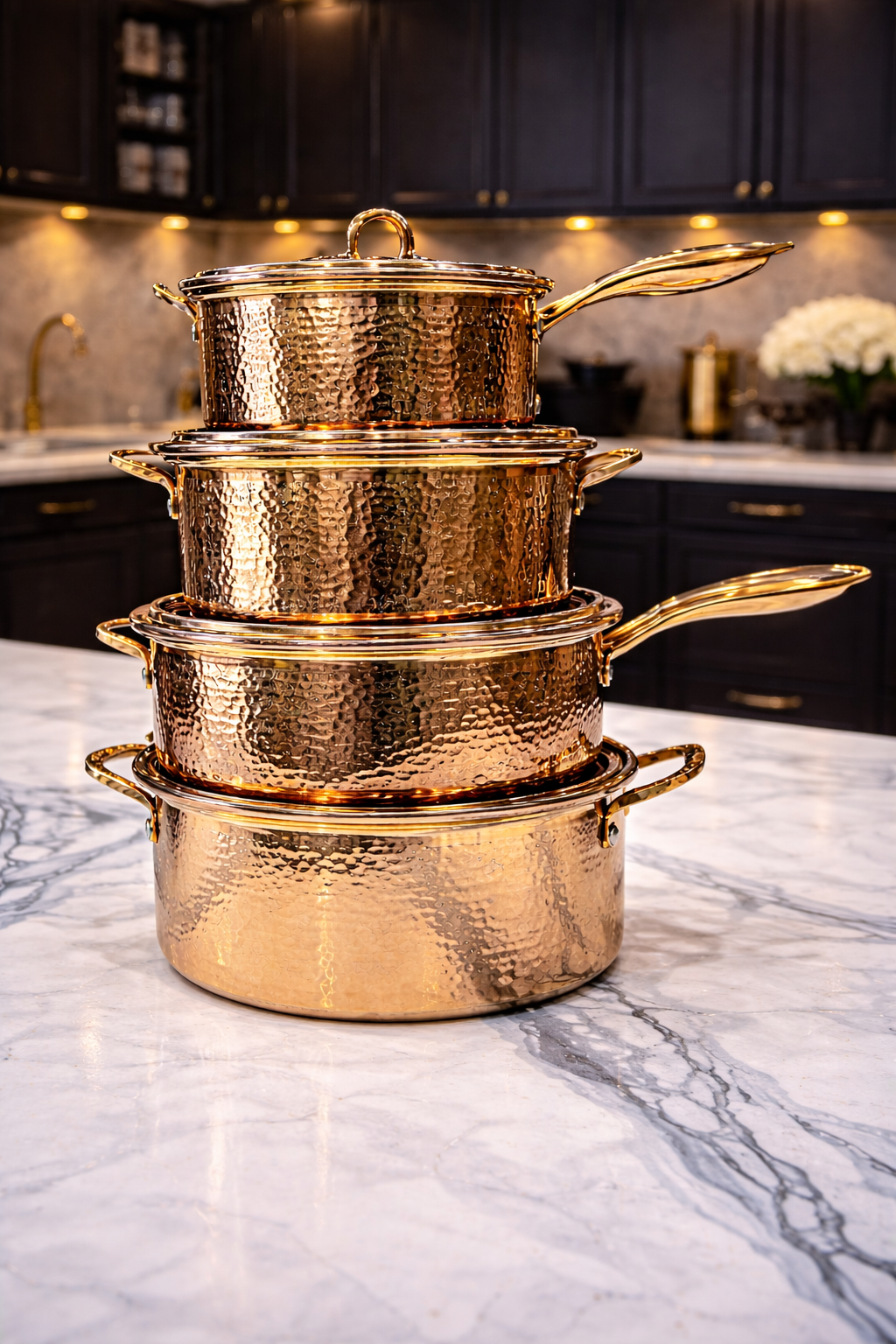 Add elegance and performance to your kitchen with this luxury hammered cookware set, designed to combine style, durability, and everyday functionality. The beautiful hammered gold finish gives the cookware a premium look that stands out in any modern kitchen.